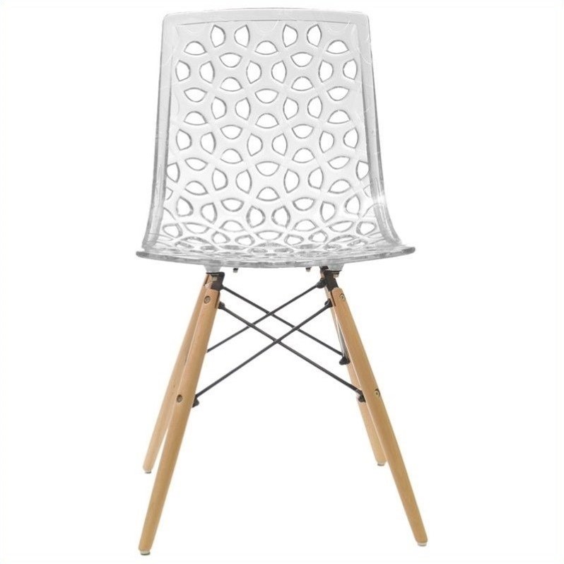![]() AEON Furniture - Dining Chairs - AE8092Clear / Wood Legs - Add style and texture to your home or office space with the striking Sandra chair. A leaf-like, cut-out pattern on the back and seat and slender dowel legs define its gorgeous look. The powder coated cross wire base offers a sturdy support to the chair. This contemporary chair is crafted from translucent polycarbonate, steel and wood. Its non-marking plastic feet protect your floor from scratches and abrasions. Finish: clear; Made of polycarbonate and steel; Intricately designed leaf-like holed pattern; Dowel style legs; Legs are capped with non-marking plastic feet. Specifications:Overall Dimensions: 32"" H x 17"" W x 17.5"" D; Seat Dimension: 17.5"" H x 16.5"" W x 16.5"" D. Price: 208.99 |