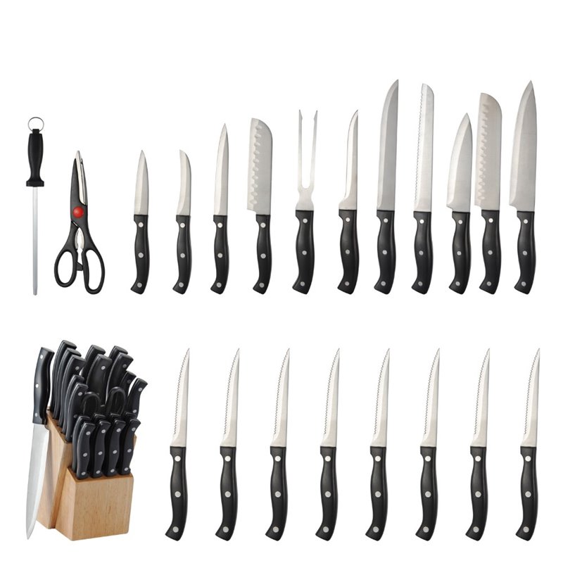 ![]() Aramco - Cutlery Sets - HDB602 - A widely recognized brand name that brings a quality and stylish line of cookware, tableware, porcelain and cutlery to modern homes. Material: Stainless Steel Blades, ABS Plastic Handles, Rubberwood BlockTriple Rivet HandlesFull Tang KnivesStainless Steel BladesSet Includes: Wood Block, 20 Knives, Kitchen Scissors, Sharpening Steel8"" and 6"" Chef's Knives, 8"" Bread Knife, 8"" Carving Knife, 6"" Boning Knife, 6"" Fork Knife, Sharpening SteelRubberwood Block7"" and 5"" Santuko Knife, 5"" Utility Knife, 3.5"" Paring Knife (2 Piece), 4.5"" Steak Knives (8 Piece), ScissorSpecifications:Overall Product Dimension: 14 "" H x 11.5 "" W x 5.75 "" DOverall Product Weight: 13 lbs Price: 58.99 |