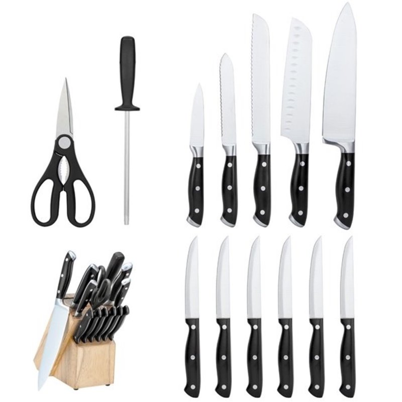 ![]() Aramco - Cutlery Sets - HDC601 - A widely recognized brand name that brings a quality and stylish line of cookware, tableware, porcelain and cutlery to modern homes. Material: Veneer Rubber Wood Block; Stainless Steel Blades; ABS Doulbe Bolster; Triple Rivet Handle4 Rubber Feet for Secure Counter GripRubbery Wood Block with Pine Interior, Giving It a Natural LookSpecifications:Overall Product Dimension: 7 "" H x 14 "" W x 18 "" DOverall Product Weight: 9 lbsSet Includes: 8"" Chef Knife, 7"" Santuko Knife, 8"" Bread Knife, 5"" Serrated Utility Knife Set Includes: 4.5"" Stamped Steak Knife (6Piece), 3.5"" Paring Knife, 8"" Scissors, 8"" Sharpening Steel, Wood Block Price: 63.99 |